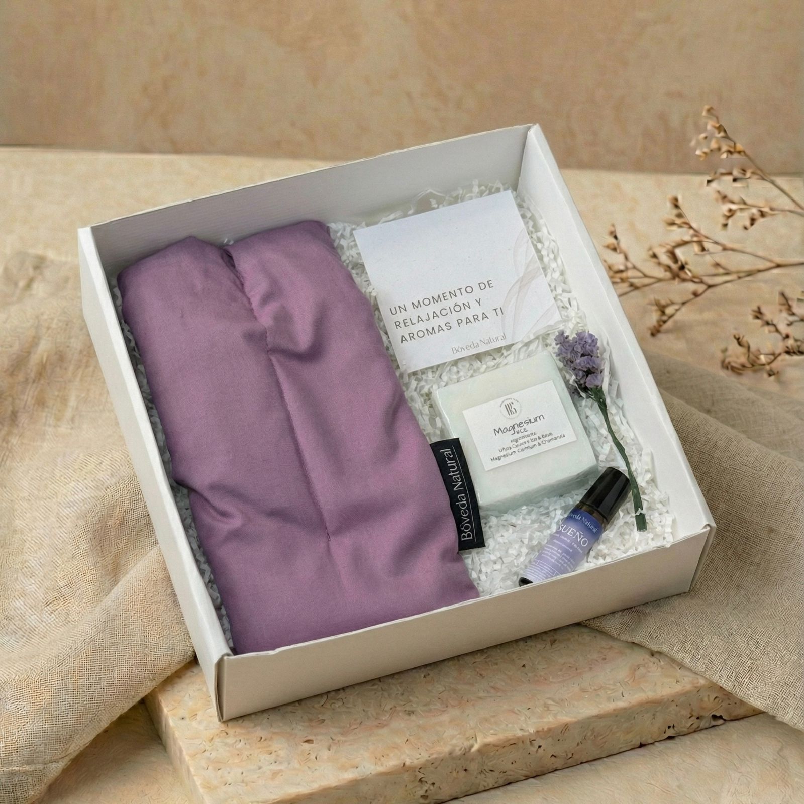 Un set pensado para acompañar noches más tranquilas: incluye una almohadilla térmica de lavanda y trigo para aliviar tensiones como dolores musculares o migraña, un jabón de magnesio y un roll-on de sueño para completar tu ritual de descanso.