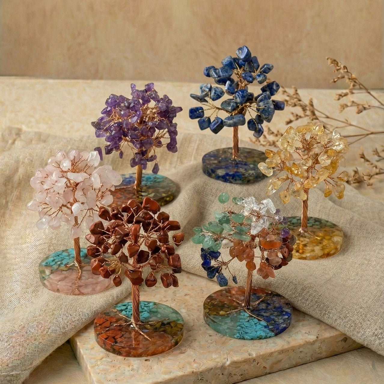 Un hermoso Árbol de la Vida con base de piedras de 7 chakras, citrino, lapislázuli, cuarzo rosa, amatista y jaspe. Una pieza que simboliza crecimiento, conexión y equilibrio.