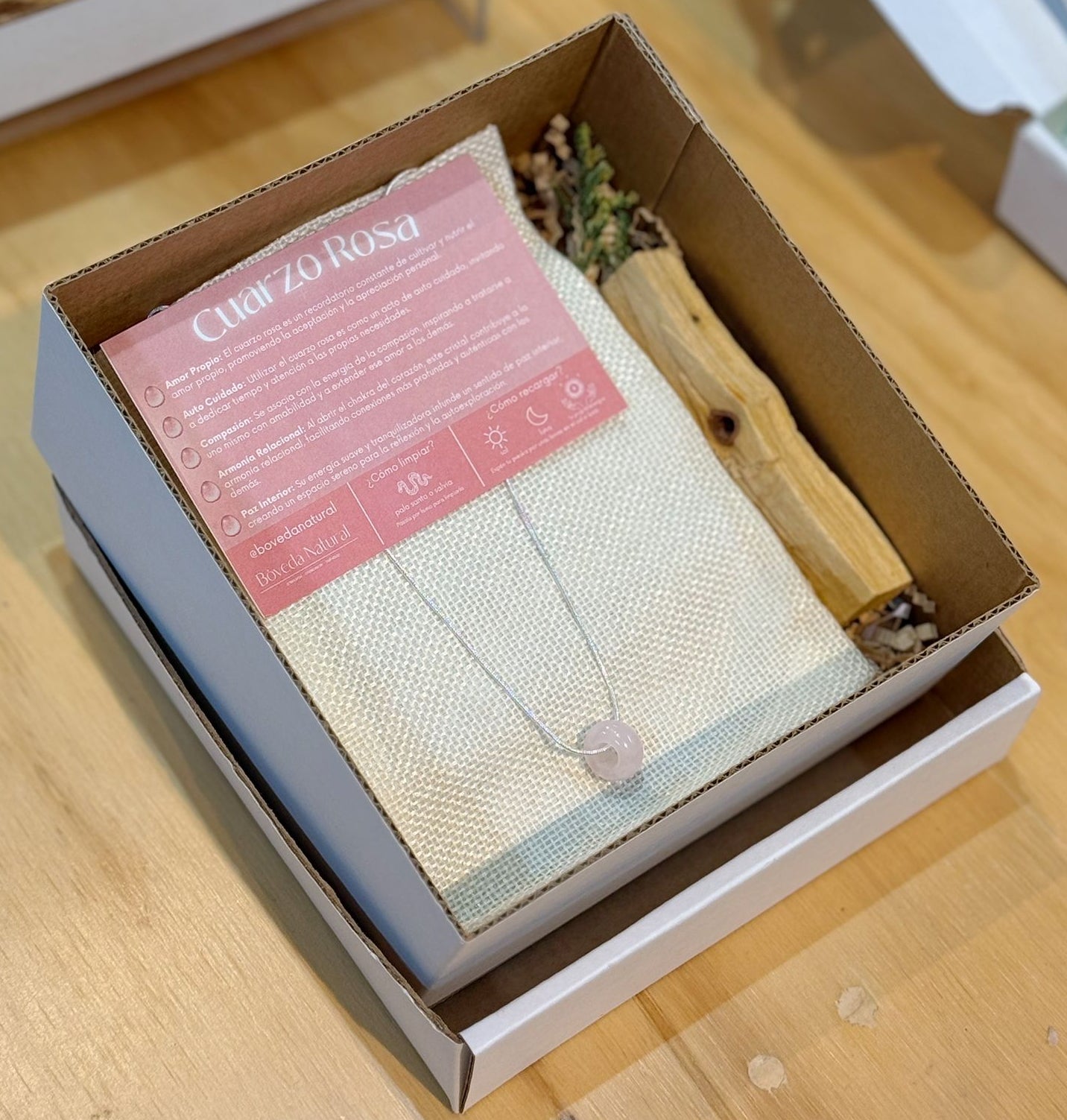 Un detalle tierno y lleno de energía suave: un collar con un dije de bolita pequeña de cuarzo rosa acompañado de un palo santo. Un dúo que mezcla belleza simple con intención amorosa.