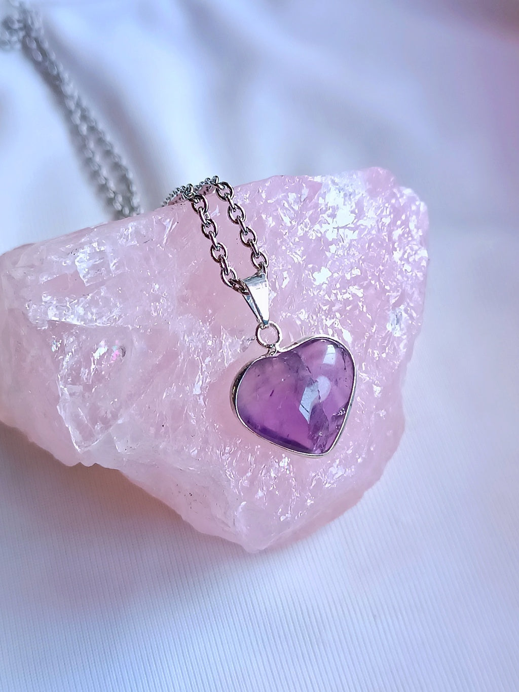 💎 Detalle: Elaborado con amatista natural en forma de corazón, cada dije es único, con variaciones sutiles en tono y brillo que realzan su belleza auténtica. Perfecto para llevar contigo o regalar como símbolo de paz y amor espiritual.