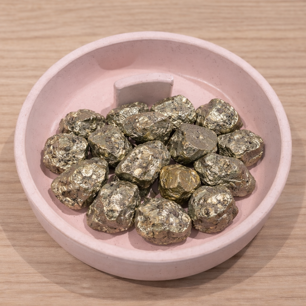 💎 Detalle: Cada pieza de pirita natural es única, con destellos metálicos que reflejan su fuerza y elegancia. Ideal para rituales de prosperidad, meditación o decoración con intención energética.