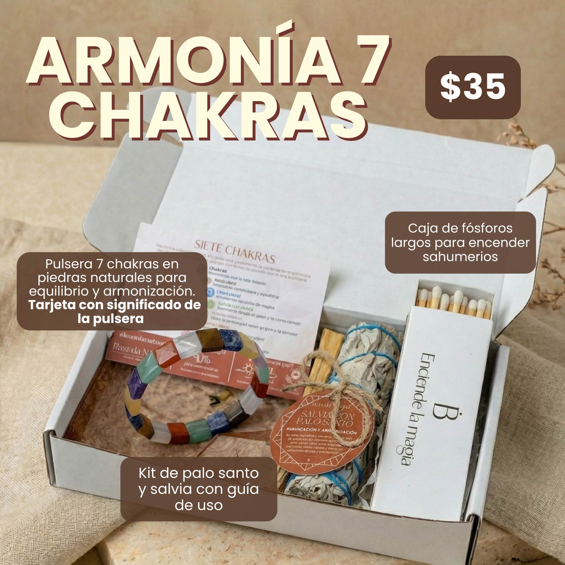 Un set completo que incluye pulsera de 7 chakras, salvia blanca, palo santo y fósforos. Un combo ideal para equilibrar energía y renovar espacios.