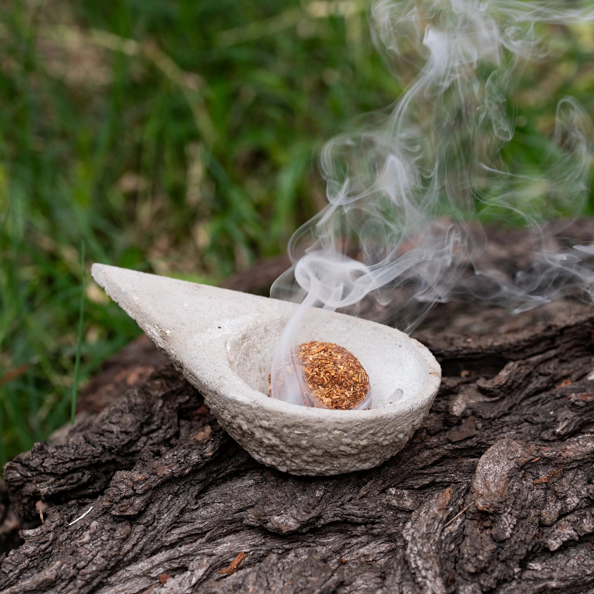 Modo de uso: Colócalo sobre una superficie estable y resistente al calor, pon el carbón encendido o el material de sahumado en su interior y deja que el humo se eleve lentamente. Puedes acompañarlo con tu intención o mantra mientras el ambiente se purifica y relaja; al final espera a que se enfríe completamente antes de manipularlo o limpiarlo.
